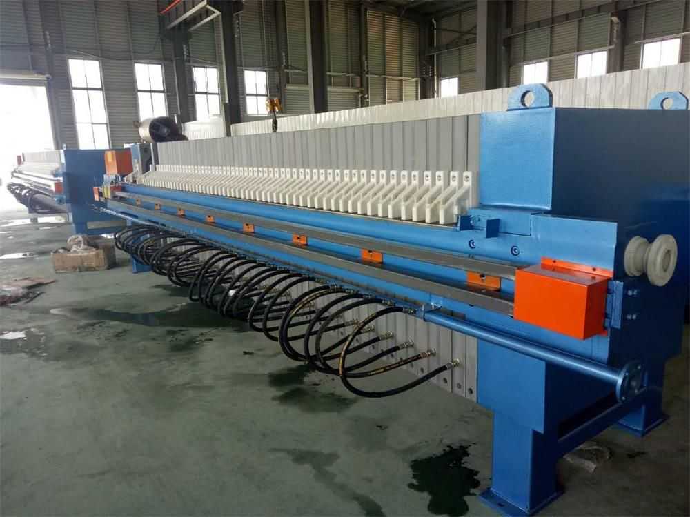 隔膜壓濾機(jī)和常規(guī)箱式壓濾機(jī)的主要區(qū)別在于,在濾板的兩側(cè)都增加了兩個(gè)彈性膜(復(fù)合橡膠膜是一個(gè)整體式膜。在操作期間,當(dāng)進(jìn)料完成時(shí),將高壓流體介質(zhì)注入膜中,并使整個(gè)膜膨脹以過濾濾餅,以進(jìn)一步使濾餅脫水,這是壓力過濾。在隔膜壓濾機(jī)運(yùn)行期間,液壓系統(tǒng)使用液壓油作為壓力載體來傳遞內(nèi)部壓力。